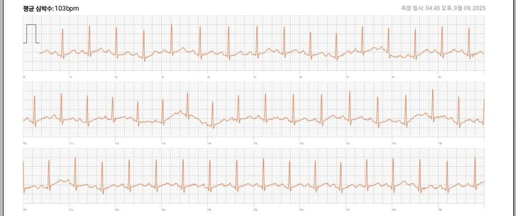올려주신 심전도 사진에서 맥이 빠른 것에 특별한 이상은 없어 보이나 워치 심전도는 정확도가 다소 떨어져 이상 소견이나 흉부 불쾌감이 있는 경우 병원을 방문하여 표준 12유도 심전도 검사를 권합니다.