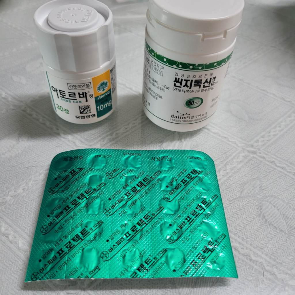 씬지록신은 아토르바정, 아스피린프로텍트정과 같이 아침 공복에 드시면돼요.