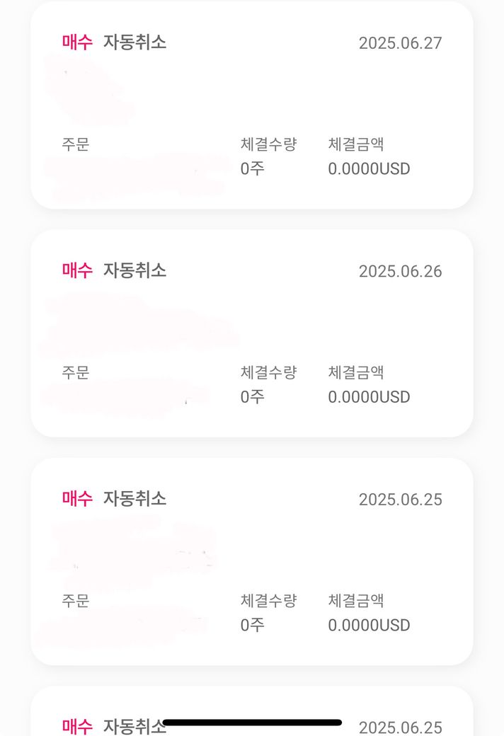 제가 금요일에 매수 예약을 했는데 매수 취소 메시지는 안 왔지만 자동으로 매수가 취소가 되었습니다. 취소가 된 이유에 대해서 자세하게 설명해주시면 감사하겠습니다.