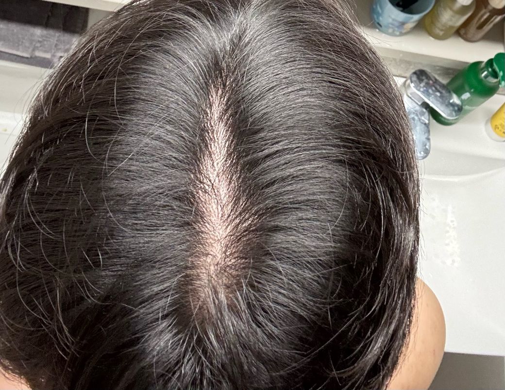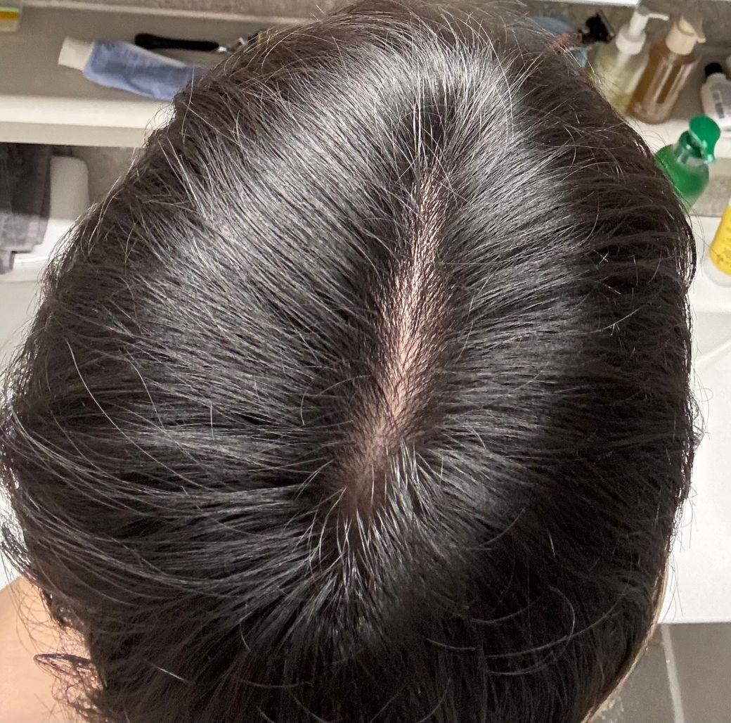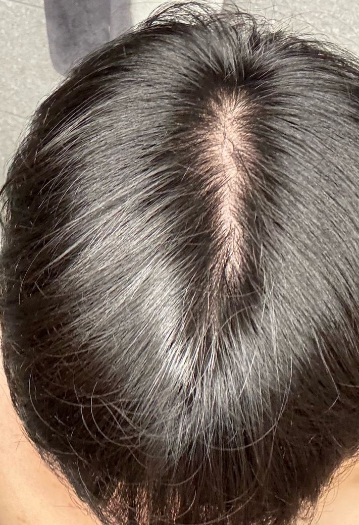 사진상 정수리 부위 가르마를 따라 두피가 비교적 선형으로 보이고, 주변 모발 밀도는 전반적으로 유지되어 있습니다. 원형으로 뚜렷하게 비는 부위는 보이지 않으며, 모발 굵기 역시 급격히 가늘어진 소견은 뚜렷하지 않습니다.
