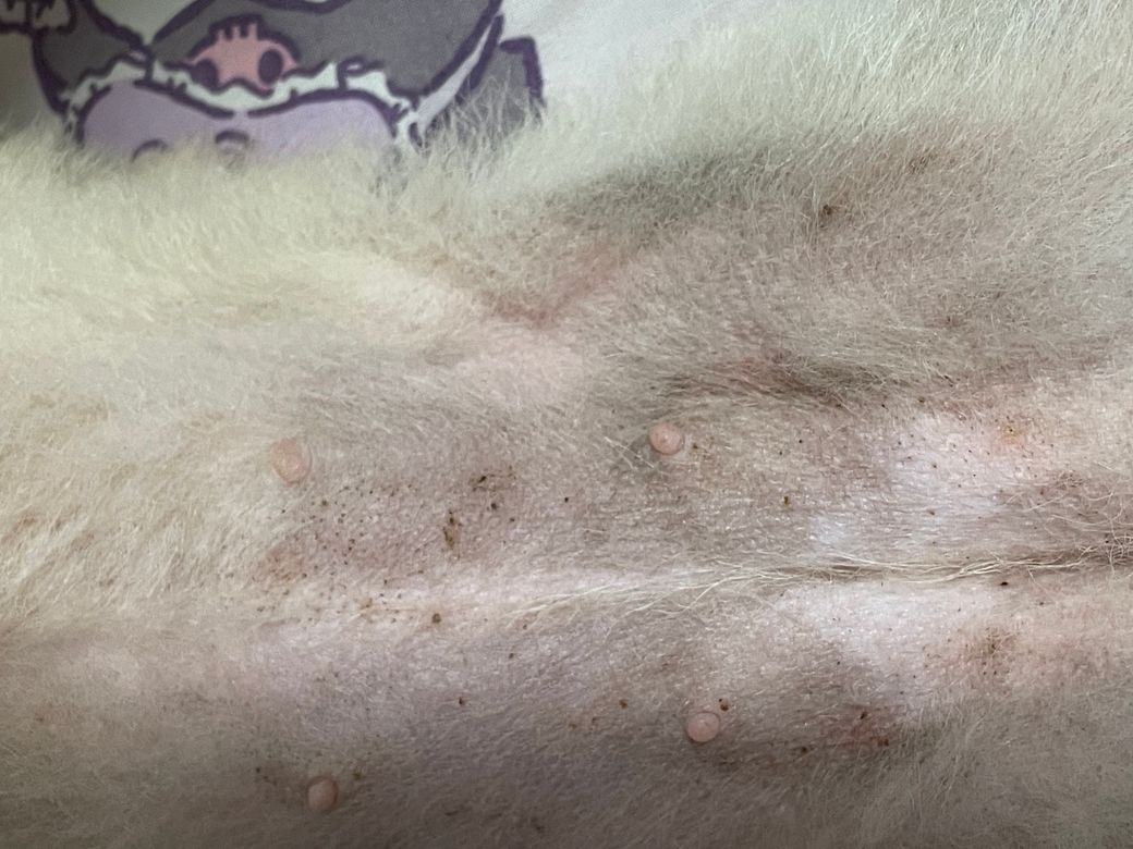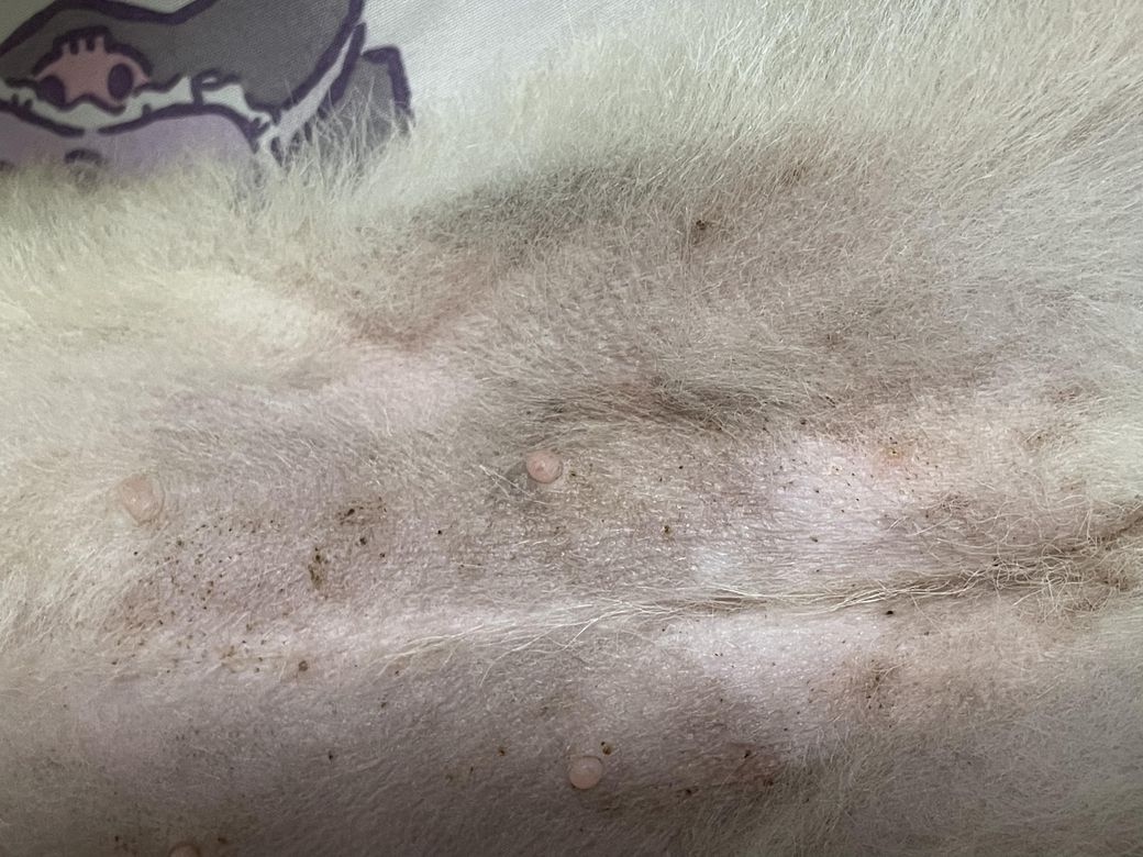 코메도라고 불리우는 여드름과 블랙헤드라고 생각하면 됩니다. 중성화 수술하지 않은 암컷이기에 호르몬 관련 질환, 내분비계통 이상 등을 고려해야 하니 종합적인 건강검진을 받으시기 바랍니다.