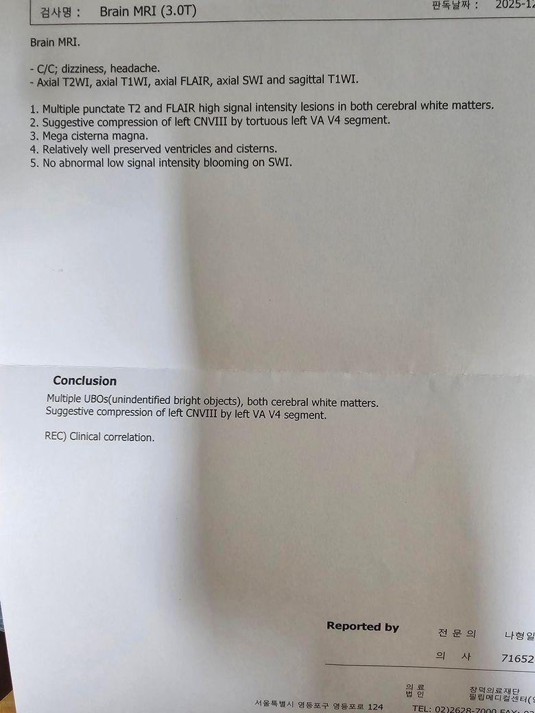 결론 부분만 보면 8번 뇌신경이 혈관에 눌린 것으로 생각된다고 합니다. 증상과 연관되어있는지 파악이 필요합니다.