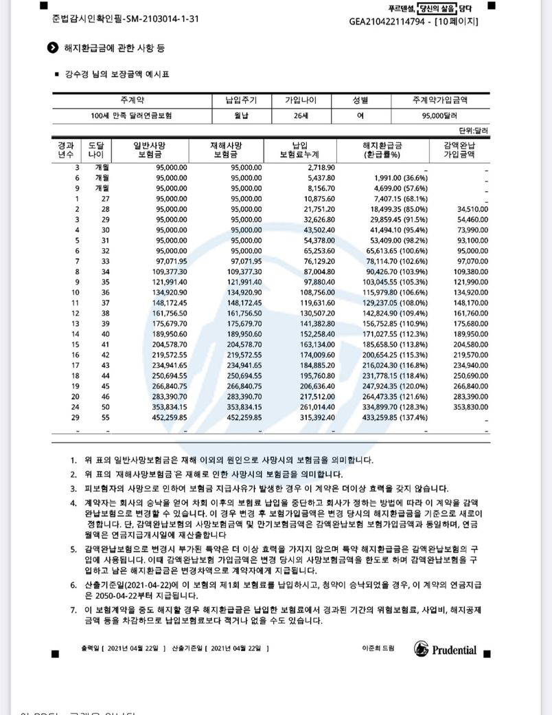 표시된 해지 환급금은 해지시 고객님께서 실제로 받으시는 환급금입니다(달러).