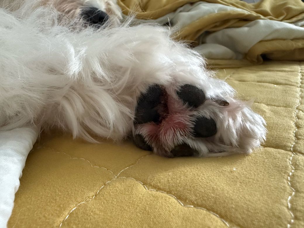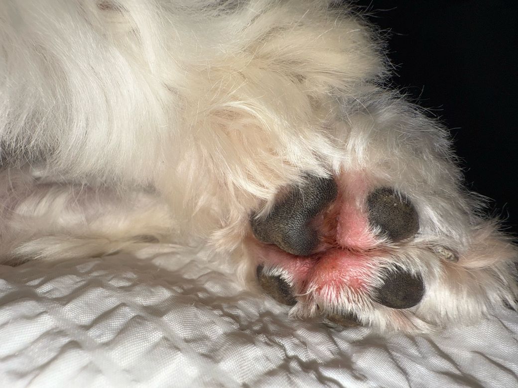 강아지 발바닥 붉게 부음 만지면 아파함 핥음