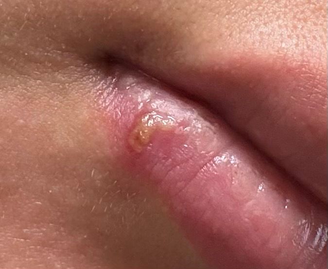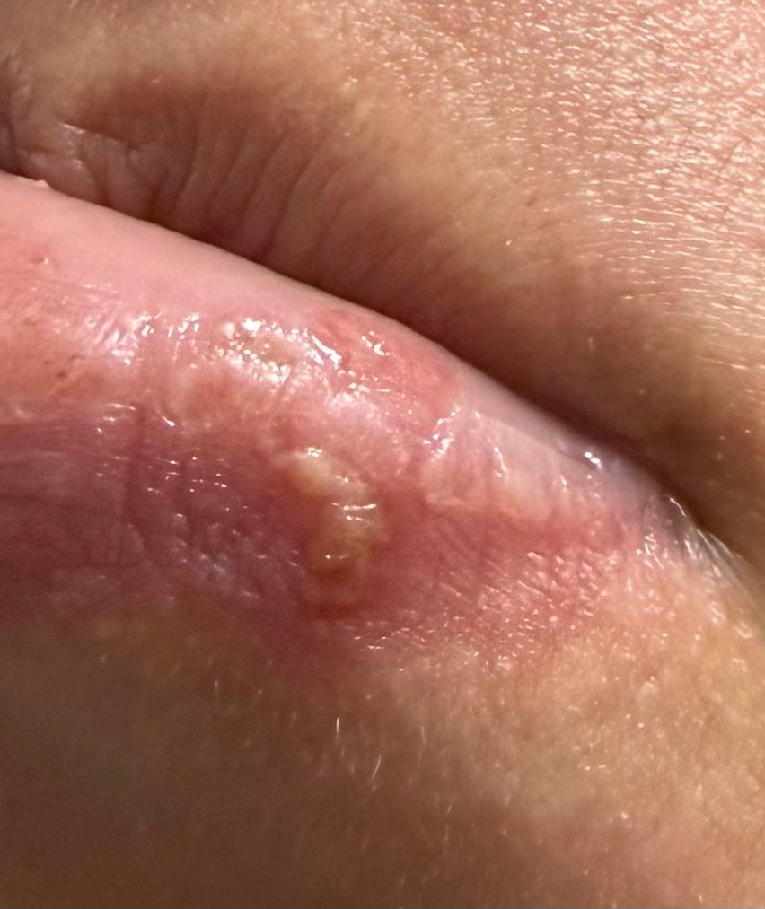 사진 소견상 입술 경계 부위에 작은 수포가 터지면서 노란 가피가 형성된 형태로, 단순포진(구순 헤르페스) 가능성이 가장 높습니다. 이는 헤르페스 바이러스가 몸에 잠복해 있다가 피로, 면역 저하, 호르몬 변화 등으로 재활성화되면서 나타나는 질환으로, 처음에는 물집 형태로 시작해 터지면서 현재처럼 딱지 형태로 진행되는 것이 전형적인 경과입니다.