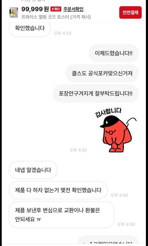 [급]제가 번개장터에서 물품(아이돌 굿즈)를 판매했는데 상대방이 물건을 받은후 해당 제품이 비공식 굿즈라고 환불을 요구합니다.