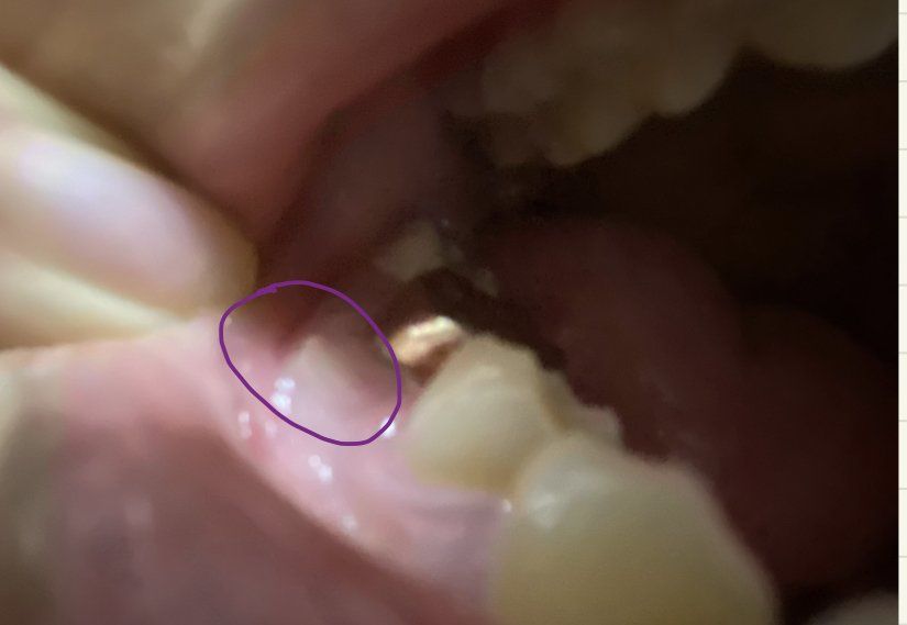제가 요번 2월달에 치근단절제술을 받았습니다. 받은 후 아무런 통증도 없고 잘 있는 것 같았습니다. 하지만 저번주 토요일부터 잇몸 옆에 흰색 고름이 생기기 시작했습니다. 이게 염증인 것 같은데 염증만 빼고 지켜보면 될까요? 임플란트는 사정상 안 될 것 같습니다. 보라색 동그라미 안에가 흰색 고름이 생긴 부분 입니다.