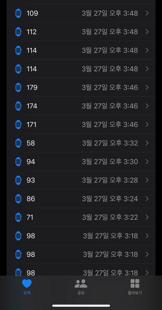 심박수 차이가 이상한데 애플워치 오류인가요? 갑자기 확 낮았다 높았다 하는게 있네요 저때 그냥 걷고 있었거든요 그냥 오류인가요?? 시간도 이상하고