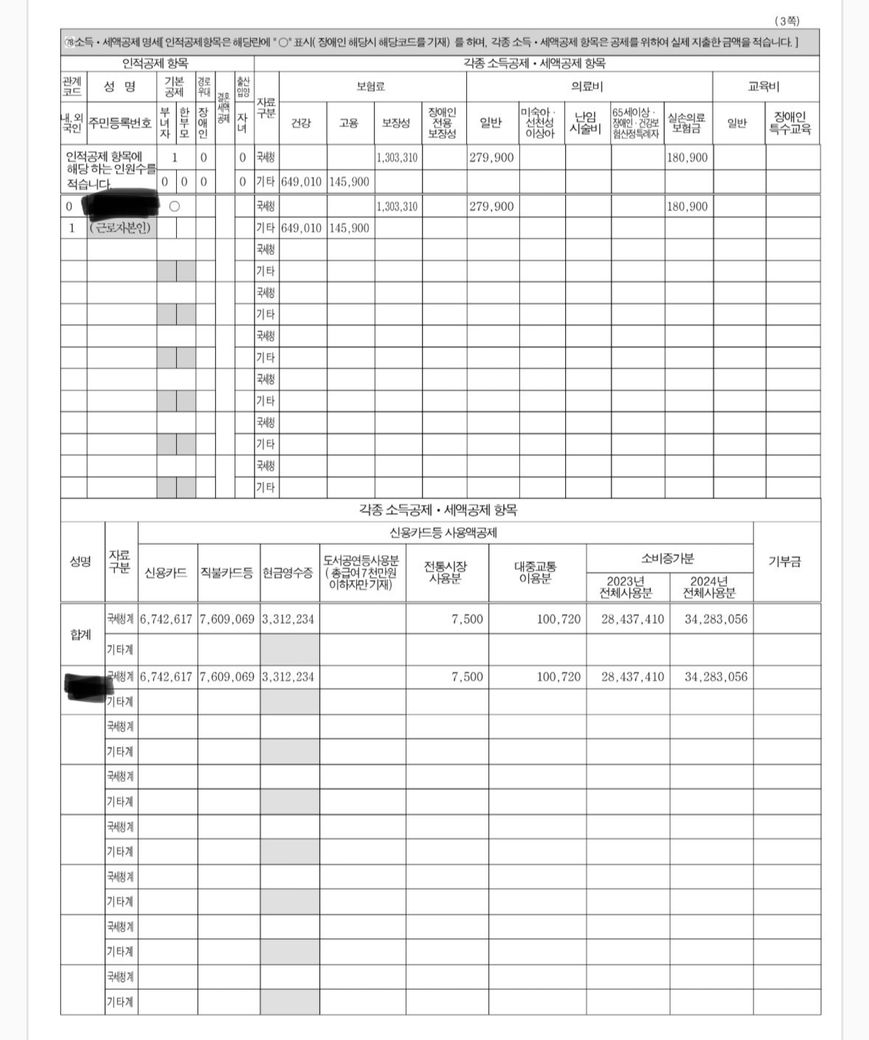 기본한도 300만원을 모두 만족한것으로 보이며, 전통시장,대중교통등추가공제, 전년도 대비 소비증가분을 고려했을때 특이사항은 없어보입니다.