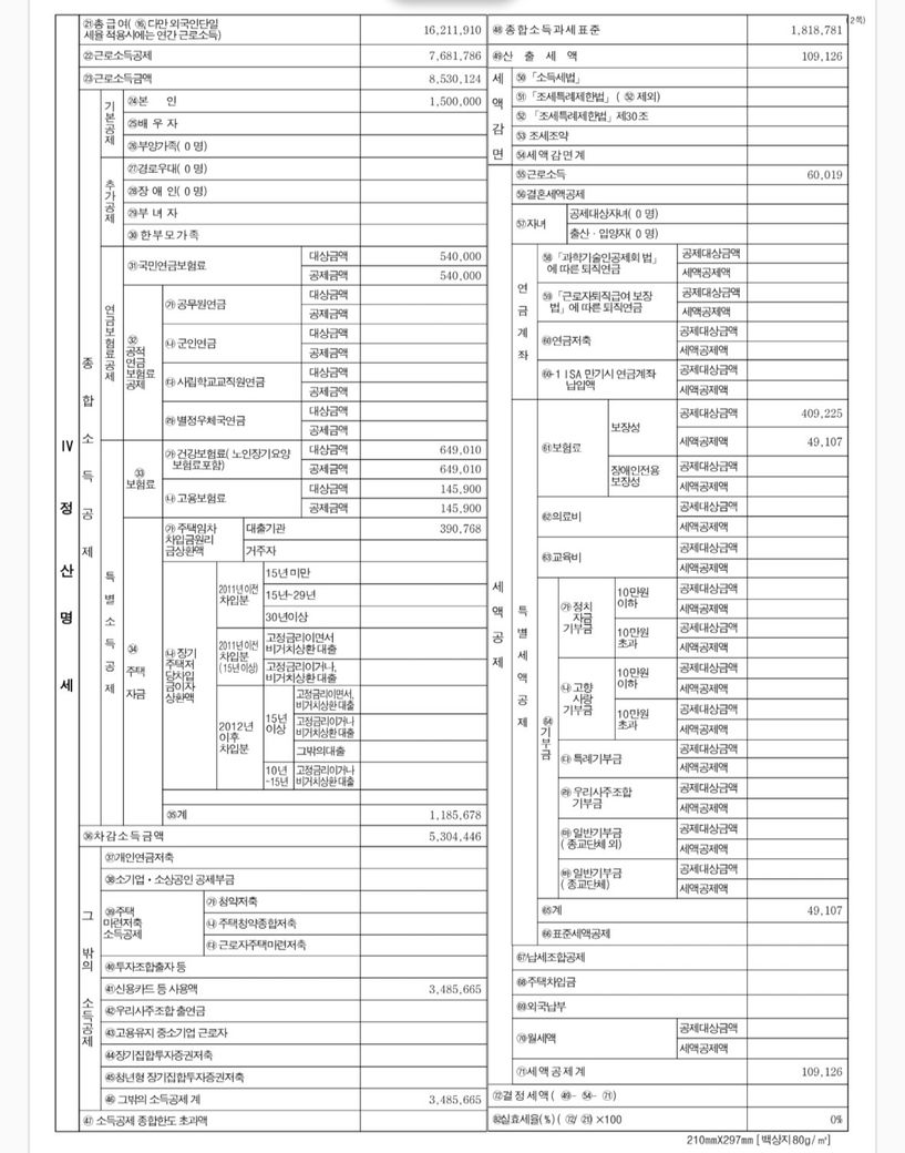 문제 없습니다. 첫번째 페이지의 결정세액이 0원이라는 것은 이미 모든 공제를 받아서 납부할 세금이 없다는 의미입니다. 따라서 기존에 납부한 기납부세액 약 22만원이 100% 환급이 된 것입니다.