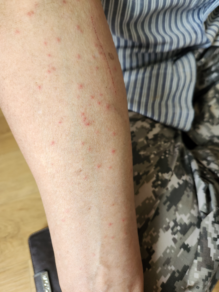식중독보다는 접촉성 피부염으로 보입니다. 음식물 알러지가능성도있습니다. 단순히 알러지발생한것일수있어 근처의원이나 전문피부과 진료를 보시면좋을것같습니다