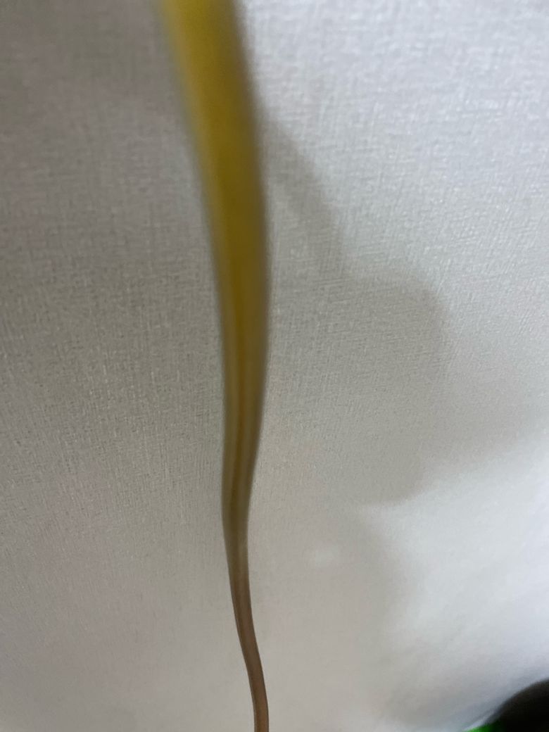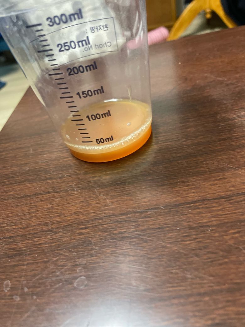 사진에서 보이는 배액액은 주황색에서 연갈색의 혼탁한 소량 액체로, 수술 후 혈액과 조직액이 섞인 형태로 흔히 관찰되는 양상입니다. 선홍색 출혈이 아니라는 점에서 급성 출혈 가능성은 낮아 보이며, 시간이 지나면서 색이 옅어지고 양이 감소하는 회복 단계의 흐름으로 해석됩니다.