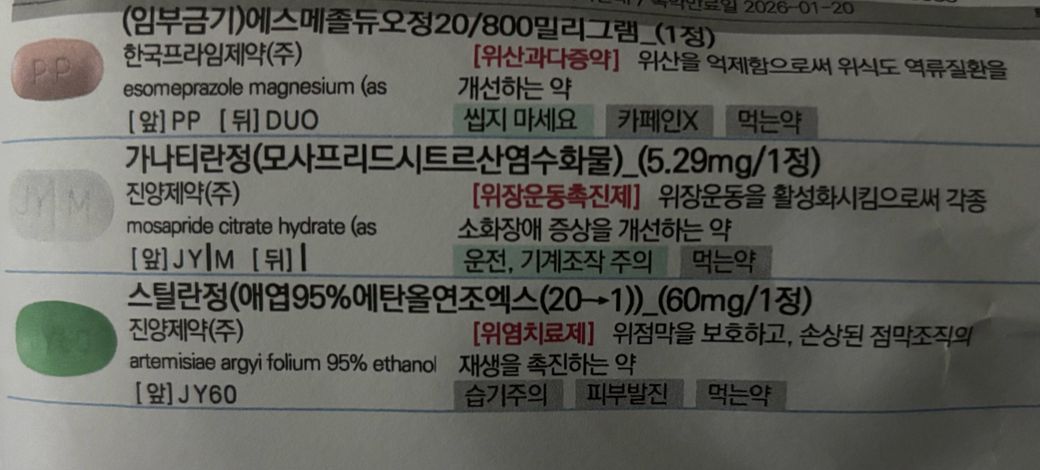 사진 처방은 위산억제제와 위장운동촉진제(모사프리드) 그리고 위점막 보호제 조합이라서 여기에 트리메부틴을 추가로 상시 병용하는 것은 권장드리기 어렵습니다. 트리메부틴은 장운동을 조절하는 약이라 필요 시 단기간 추가는 가능하지만 모사프리드와 겹치면 설사나 복통 또는 변비 같은 위장 증상이 더 도드라질 수 있어 한 가지로 정리하는 편이 좋습니다. 반하사심탕은 같이 드시더라도 처방약과는 1시간에서 2시간 정도 간격을 두고 복용하시는 것이 안전합니다. 속불편이 지속되거나 통증과 구토가 동반되면 처방 조정이 필요합니다. 감사합니다.