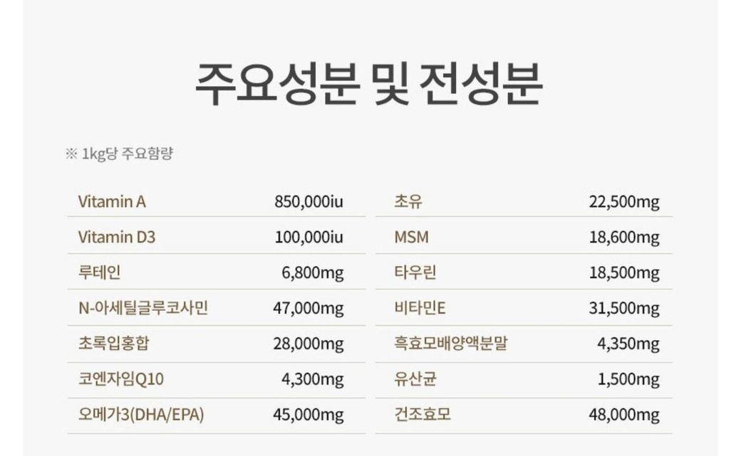 비타민, 오메가3, 유산균 등의 영양 성분이 들어있는 제품으로 보입니다. 함량이 골고루 들어 있으므로 용법에 맞게 투여하면 되겠습니다. 강아지 건강에 도움이 될 수 있겠습니다.