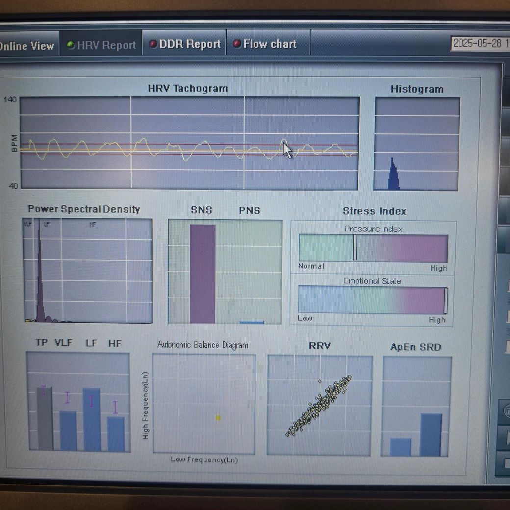 사진의 자율신경 검사 결과를 보면, 교감신경(SNS)이 매우 우세하고 부교감신경(PNS)은 거의 활성화되지 않은 상태이며, 스트레스 지수도 높게 나타나 있습니다. 여러 지표에서 심박 변이도가 낮고, 전체적으로 자율신경의 균형이 무너진 상태임을 알 수 있습니다. 이런 결과는 만성 스트레스, 피로, 수면 부족, 생활습관 불균형 등이 복합적으로 작용한 결과일 가능성이 높습니다.