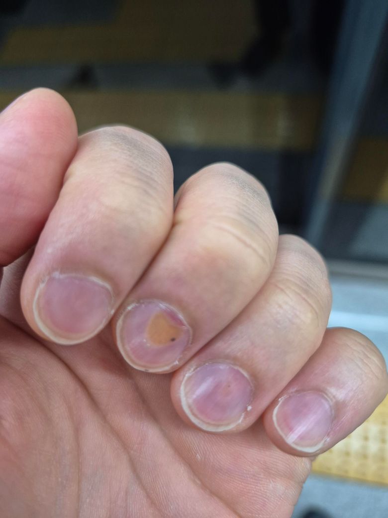 지속적인 압력, 열에 노출되는 등의 상황으로 인하여 손톱의 손상이 생긴 것으로 의심됩니다.