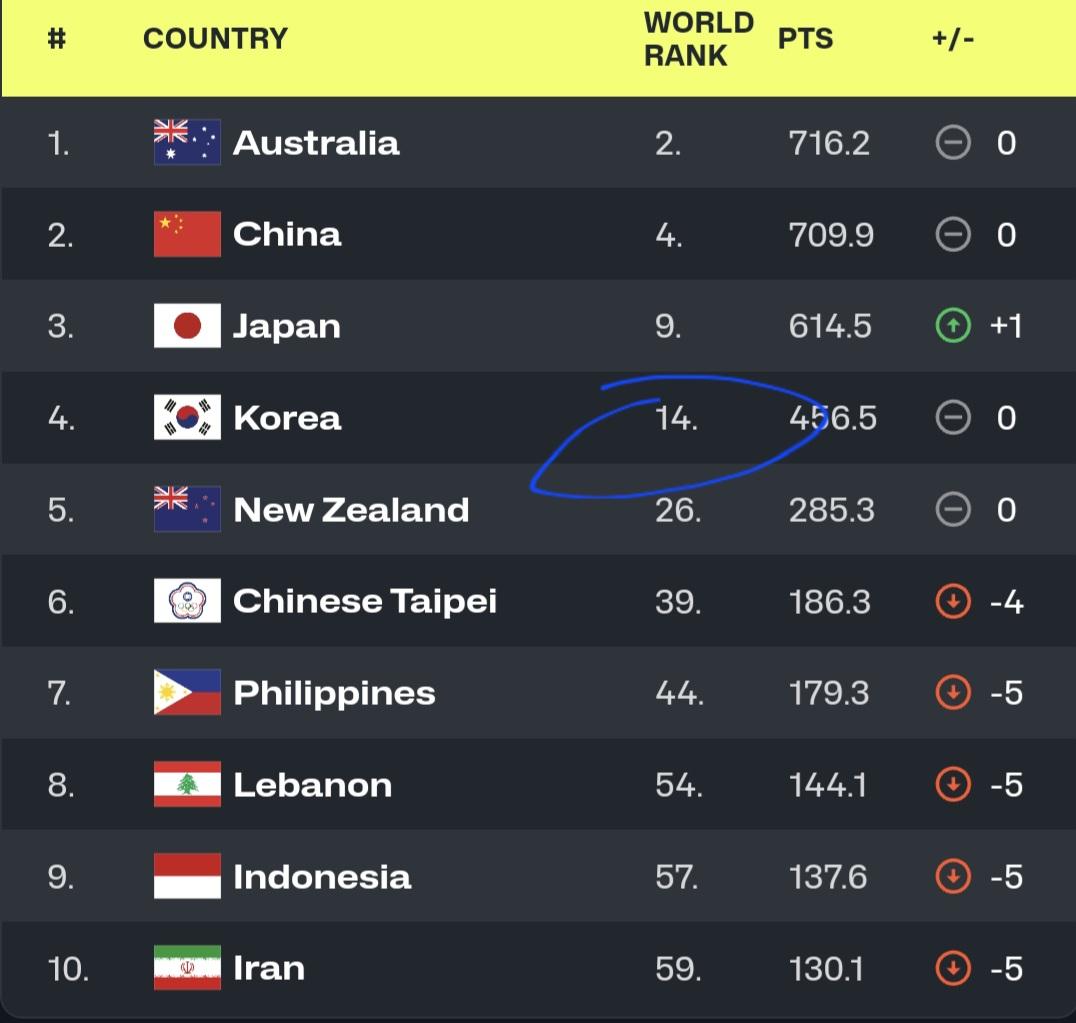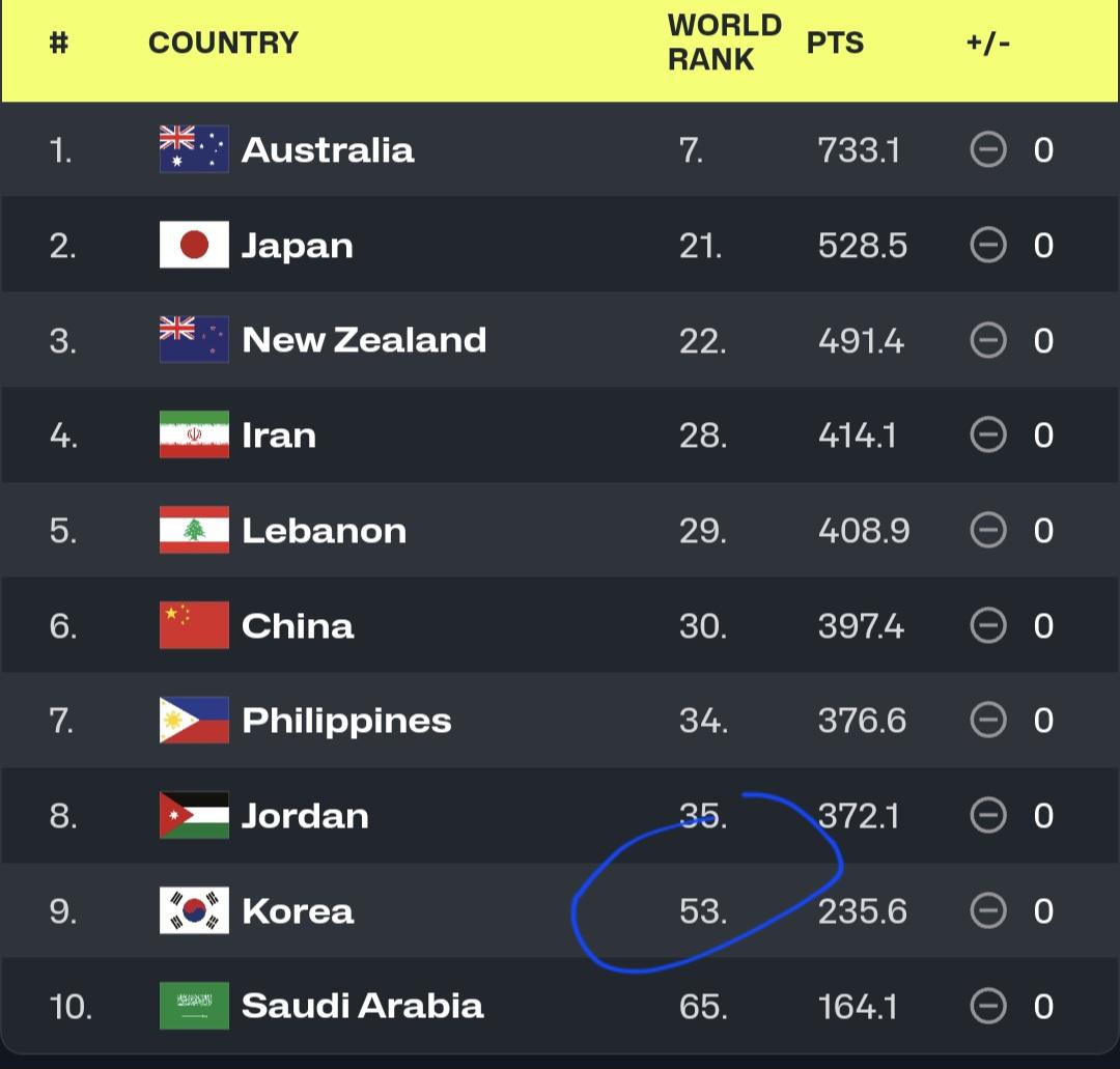 수준 높은 팀들과는 붙을 일이 거의 없고 아시아권 국가들과 거의 경기를 함에도 랭킹은 저 아래 가 있지요.
