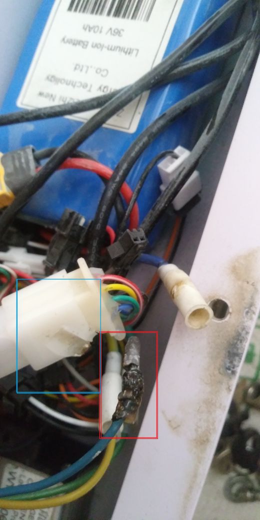 과열로 빨간 박스 안 부분 접촉 회선이 타버렸고 파란 박스 플라스틱 단자 부분도 열에 부분적으로 녹아버린 상황입니다