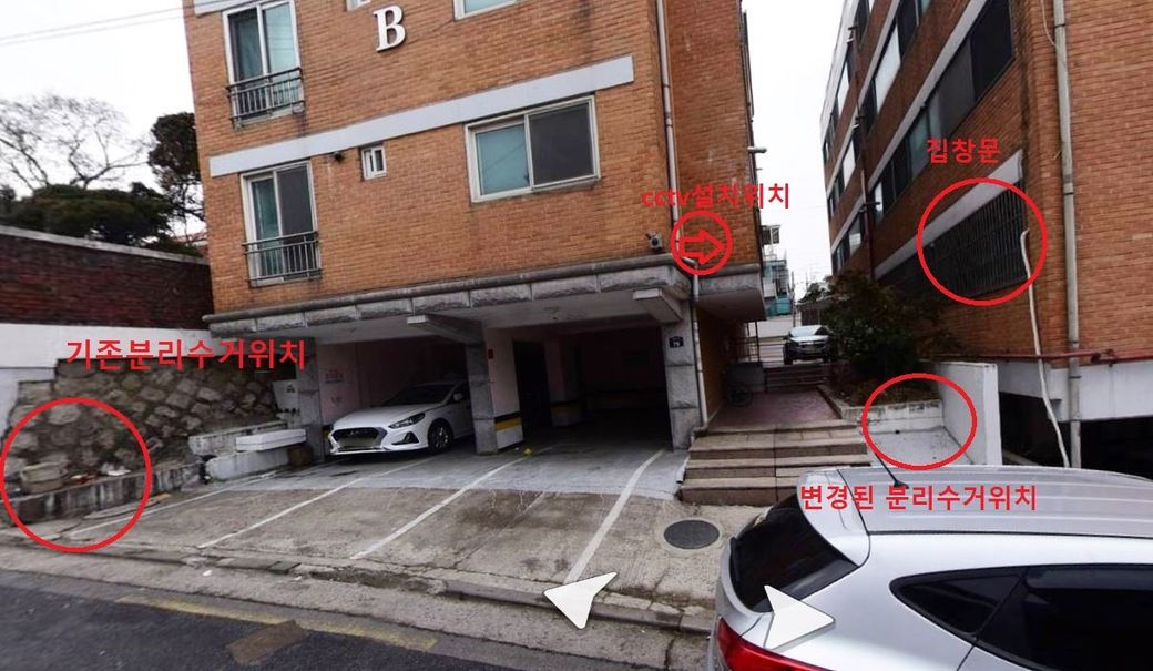 아래쪽을찍고있다고는하는데 그래도정면으로보이는cctv위치가 많이불편합니다. 변경된 쓰레기배출위치도