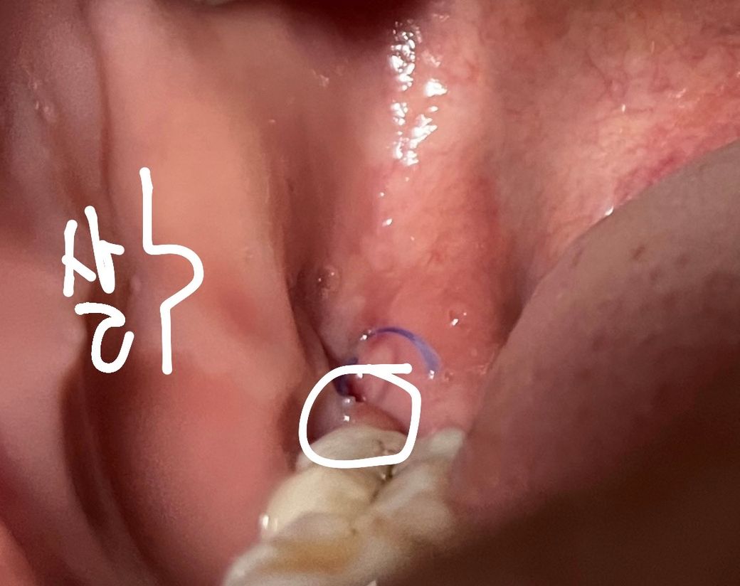 지난주 금요일날 매복사랑니 발치후 아직 실밥제거를 안한 상태인데 오른쪽 볼살이 그림처럼 튀어나와있는걸 감지했습니다. 저기에 계속 이물질이 잘껴서 양치할때 살펴보니 튀어나온 볼살이 저 부분을 계속 덮고있어서 구멍같이 무언가 낄수있게 되었습니다. 이게 실밥 풀린 상태인건가요? 치과 한번 더 가보는게 좋겠죠?