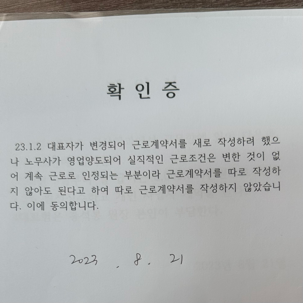 작년에 입사해 올해1월에 고용주가 변경되었고 새로 근로계약서를 쓰지않고 확인증에 싸인하라해서 주민번호쓰고 싸인만한 상태로 계속 근무중입니다