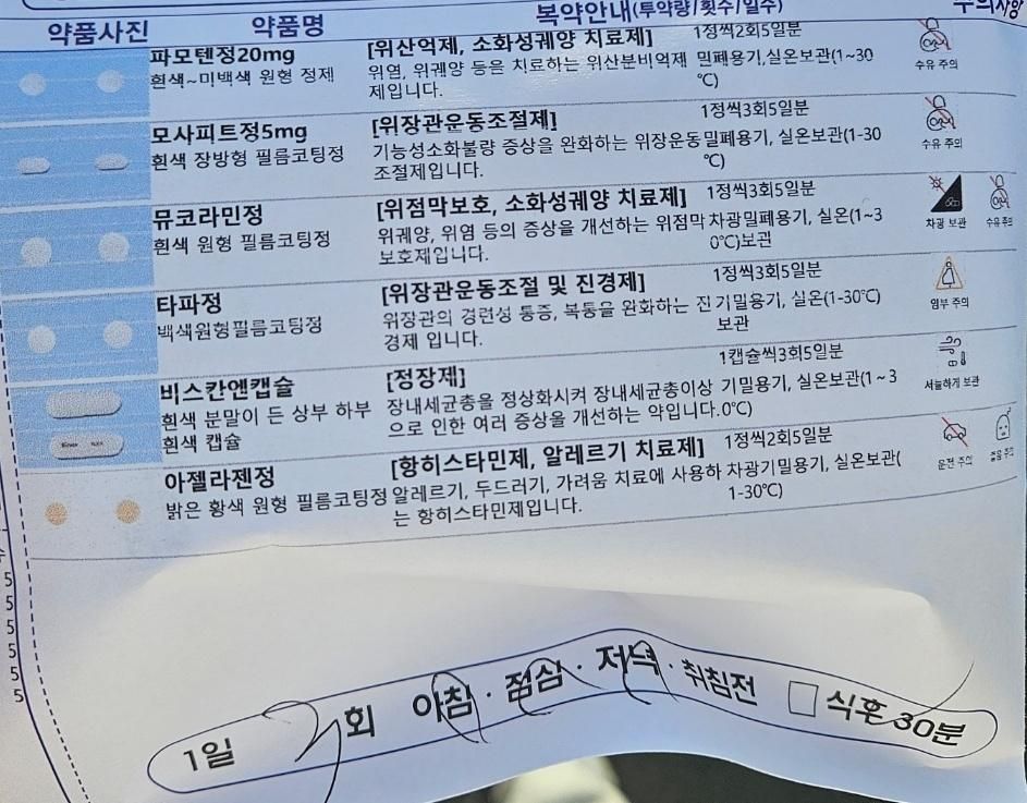 약을 먹고 나서 물이나 음료나 그런거 마시면 목에서 쓴맛이 나요 내과에서 위궤양 때문에 약을 받아왔는데 비염도 있어서 비염약도 받았어요 내과 약 여러번 받아봤는데 이번에도 쓴맛이 나네요 (사진 있습니다)