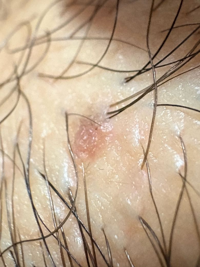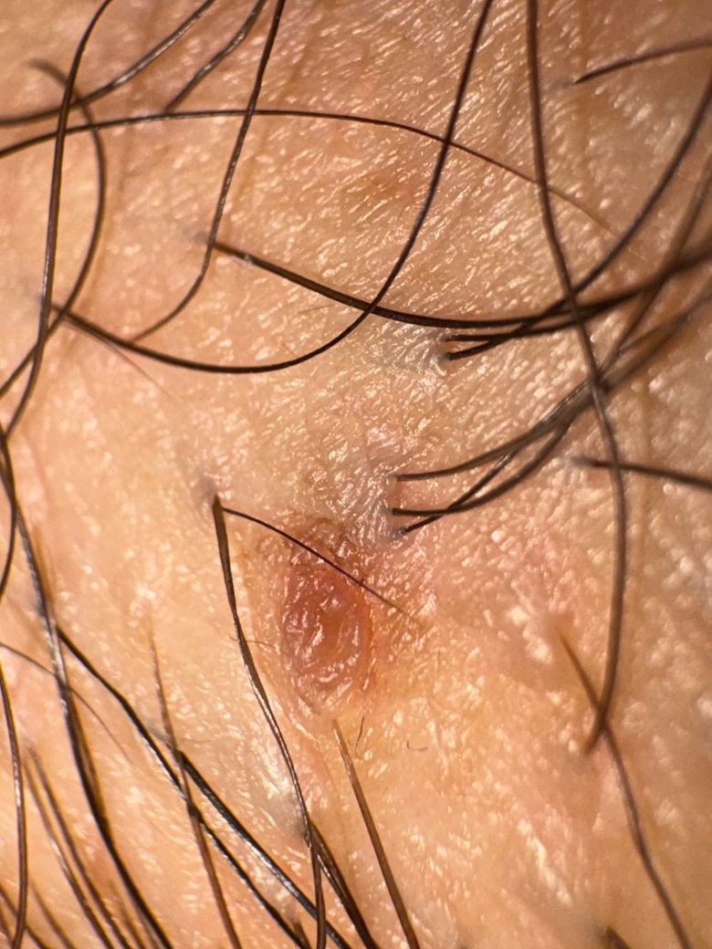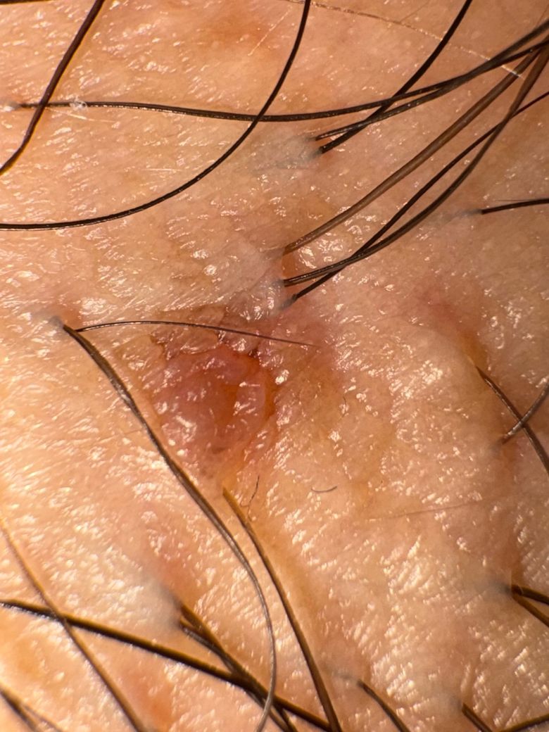 크기는 2-3mm 정도 되는거같고 위치는 성기 옆 2cm정도 떨어진 음모들 사이에 있습니다, 단일병변 이구요.