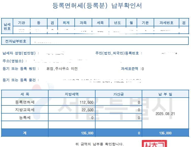 수임업체가 최근에 등기변경을 하고, 해당 등록면허세 납부확인서를 제게 보내줬는데요.