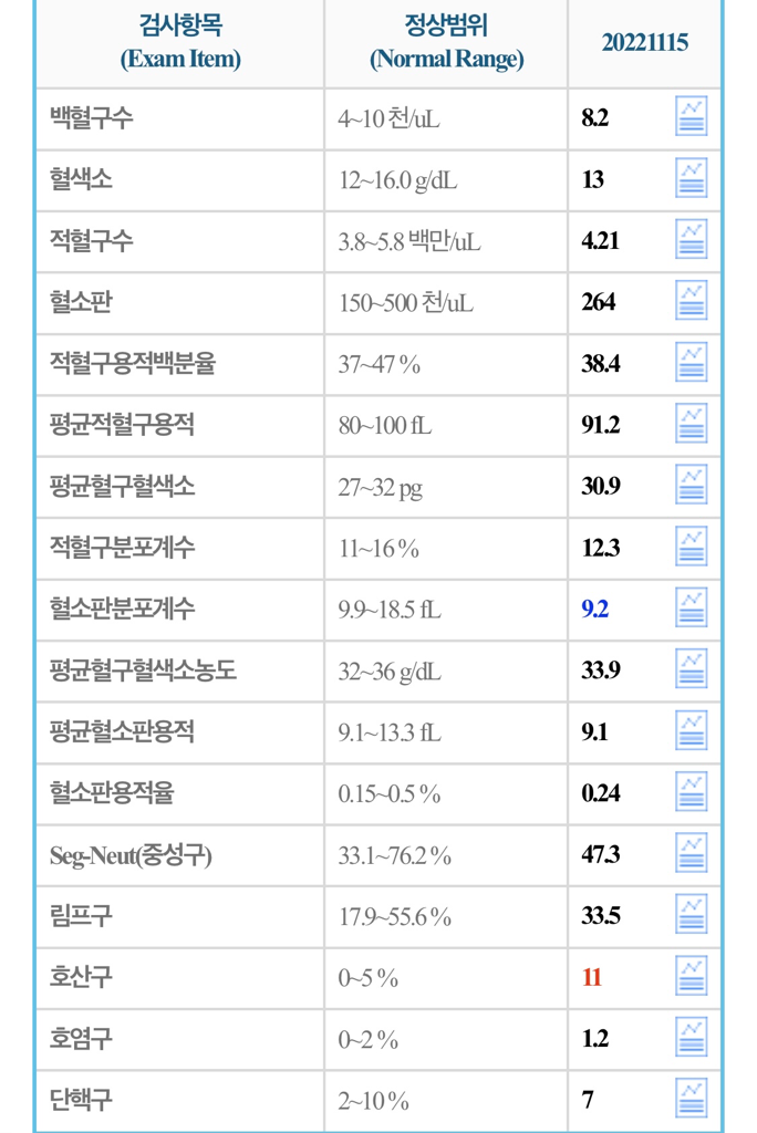 호산구는 백혈구의 일종으로 일반적으로는 면역반응이 일어나는 경우에만 유도되지만 특정한 질환에서는 호산구가 신체 각종 장기를 침범하여 증상을 유발합니다. 하지만 이 자체만으로 임상적 의미를 찾기는 어려우므로 알레르기 내과에 내원하시어 진료를 받아보시는 것이 좋겠습니다 .