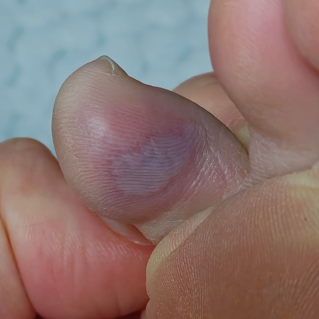 사진으로는 정확하게 판단이 불가하고 육안으로 진료 받으셔야 합니다. 우선 보랗게? 하얗게? 보인 부분이 커지고 있다면 출혈(혈종)이나 혈액순환 문제가 원인일 수 있습니다. 혈관이 손상되거나 파열되어 피가 고인 상태일 수 있습니다. 물집처럼 보이기도 하는데 사진으론 판단 불가합니다.