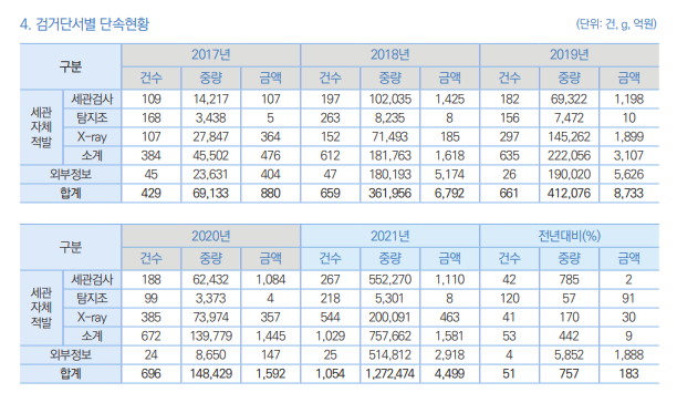 관세청은 국내로 반입되는 모든 마약류 밀수에 대해 공항·항만 등 국경에서 철저하게 추적·감시하여 적발하고 있으며, 특히 해외 인터넷사이트를 통한 신종마약 밀반입도 국제우편물과 특송화물에 대한 완벽한 세관검사로 적발한 후 통제배달 수사로 국내 구매자를 검거·처벌하고 있습니다.