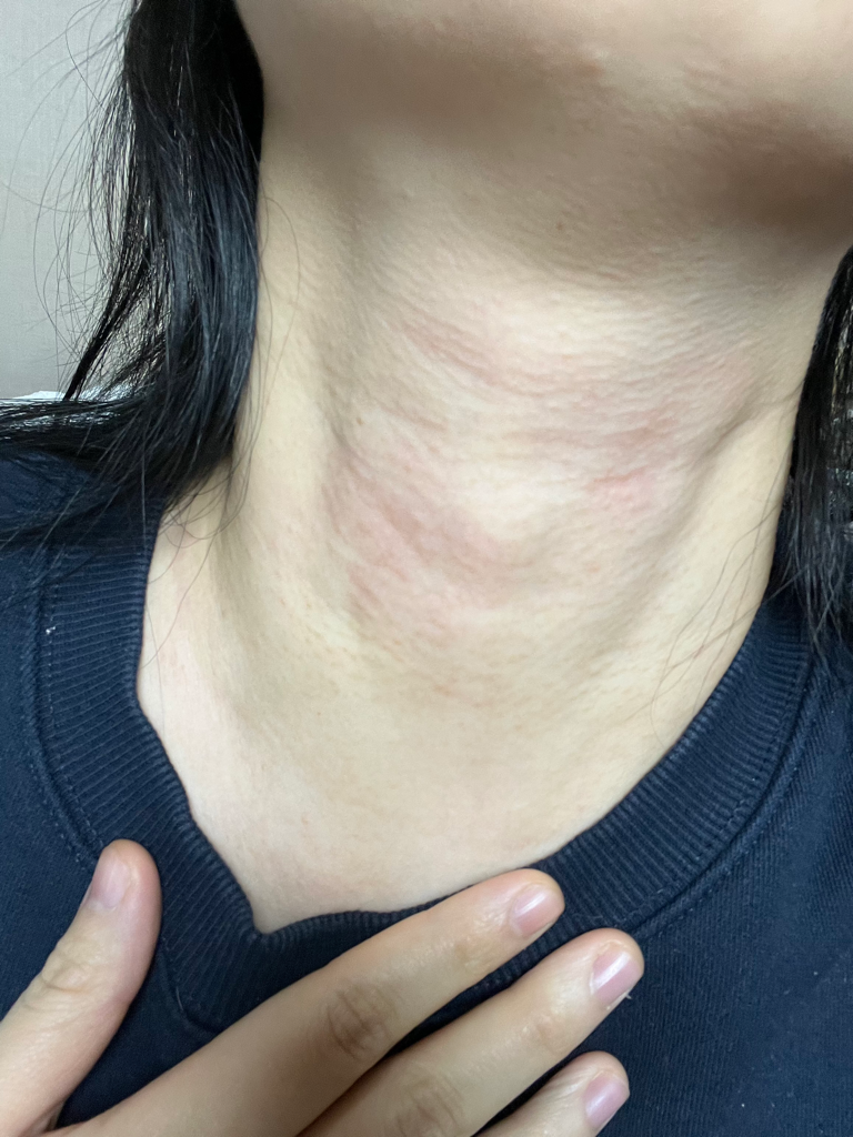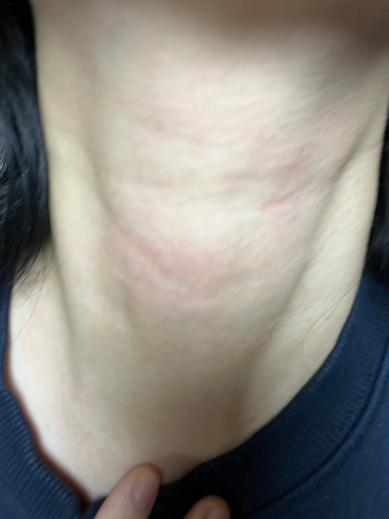 갑자기 얼굴과 목에 두드러기같은 반응이 나타냈습니다.이번주 화요일, 내일이면 3일째입니다.