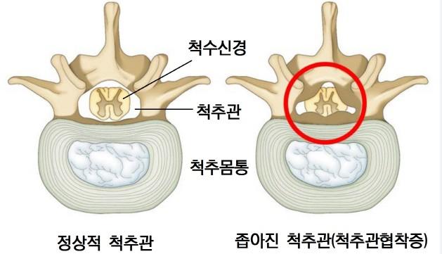 척추관 협착증은 척추관이라고 하는 아래 그림에 보이는 척수나 신경뿌리가 지나다니는 길이 좁아지는 상황을 이야기합니다.