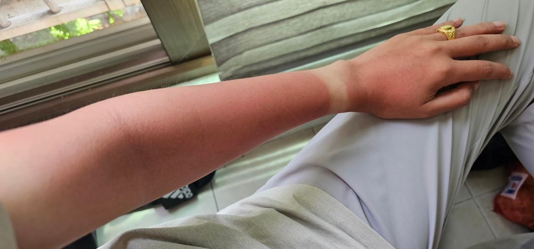 올려주신 사진으로 미루어 일광화상이 생긴 상태로 붉게 달아오른 피부를 진정시키기 위해 찬 물수건이나 얼음주머니를 사용하는데 얼음을 직접 대면 피부가 더 손상돼 수건으로 얼음을 감싼 다음 냉찜질하기 바랍니다.
