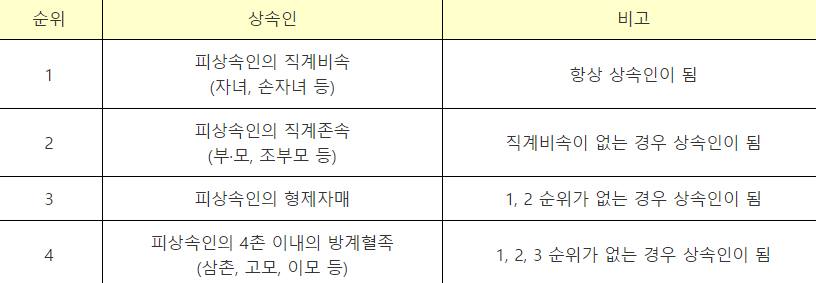 아래 표를 참고하시면 됩니다. 배우자나 직계비속, 직계존속, 형제자매가 없을 경우 친척 등에게 상속이 됩니다. 해당되는 친척이 없거나 상속을 포기한다면 국가에 귀속된다고 보시면 됩니다.