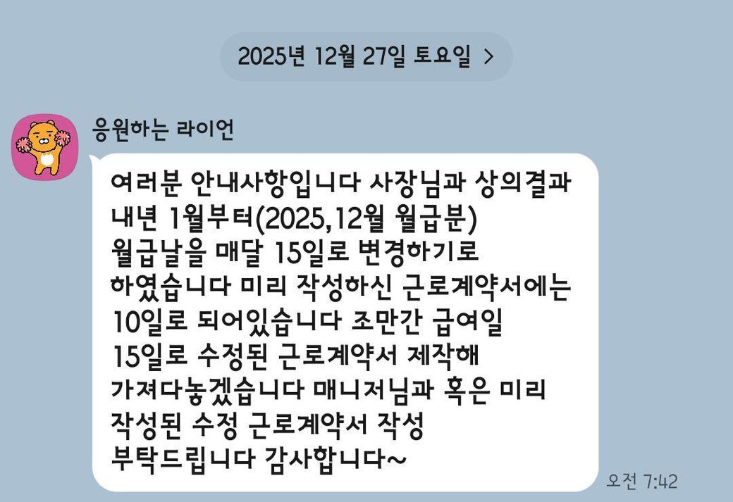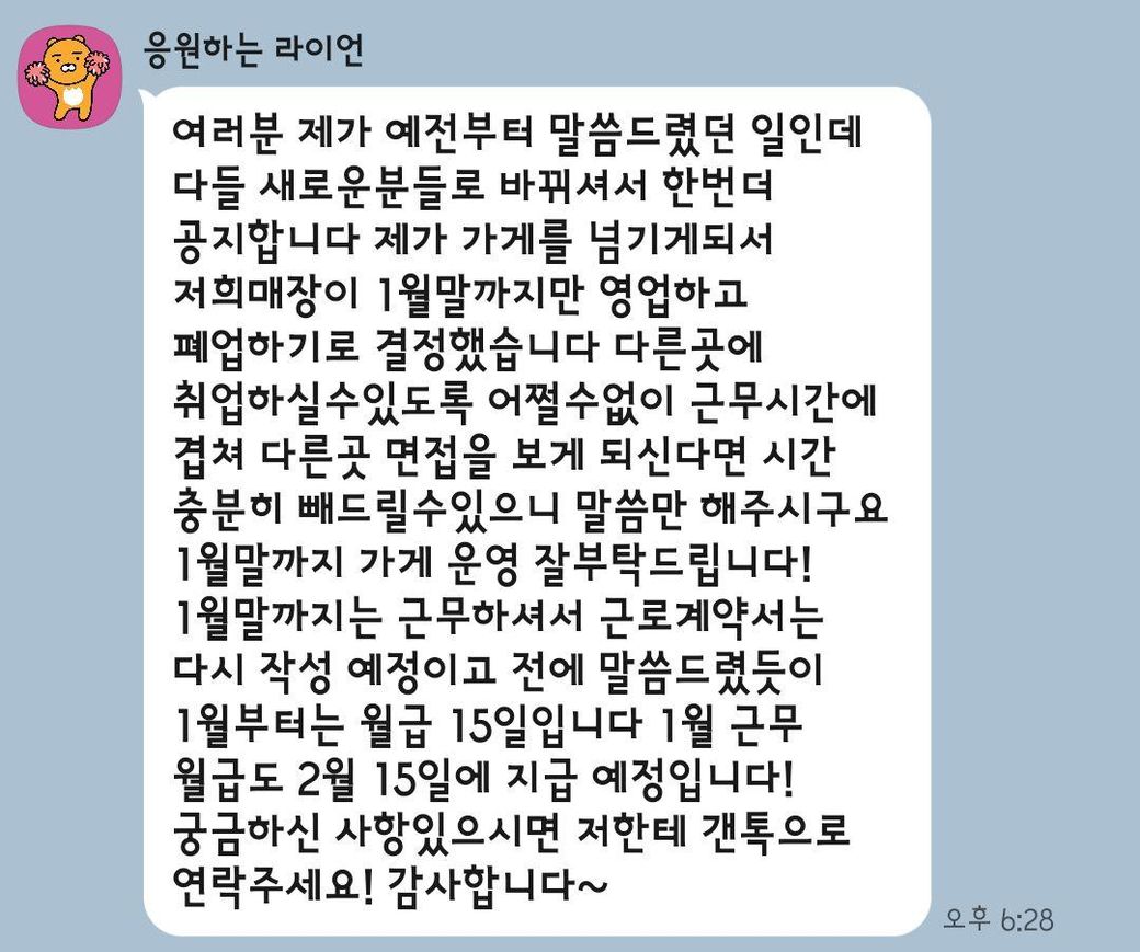 12월 27일 아침에 점장님이 전에 썼던 2026년 (12월 말까지) 계약서에서 월급날을 10일에서 15일로 미루겠다는 통보를 받았습니다. 12월 29일에 갑작스럽게 1월달 말까지만 가게가 영업한다는 것과 1월달 월급을 2월 15일에 주겠다는 것을 통보 받았습니다. 그래서 제가 일을 안하는 2월초까지 월급을 기다리는것은 나중에 문제가 되어도 해결할 방법이 어려워질수 있다고 생각이 들어서 오늘 아침 12월 30일에 일을 그만두겠다고 점장님께 말씀을 드렸습니다. 그랬더니 아래와 같은 카톡을 받고 단체 알바 톡방에도 12월 31일에 가게를 갑자기 폐점하기로 결정했다는 내용을 받았습니다. 여기에서 조금의 이익을 받을 수 있나요?