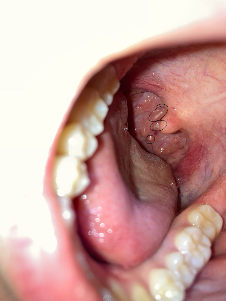 편도선염이 있는 경우에 생기는 현상입니다. 보통 곱이 끼였다고 하고 exudate 입니다. 편도에서 발생하는 염증현상으로 나타나는 결과물입니다. 이비인후과 방문하여 진찰 받고 처방받는 것을 권유드립니다.