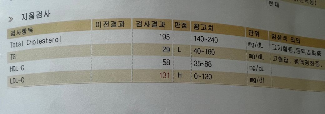 콜레스테롤 검사에서 LDL-C(저밀도지단백 콜레스테롤) 수치가 131로 정상 범위(0130mg/dL)를 약간 초과했습니다. 이 정도 수치면 식이요법이나 운동 등의 생활습관 개선을 먼저 시도해보실수 있습니다.