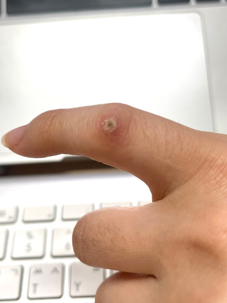 새끼손가락에 이런 게 생겼어요. 오래돼서 까먹었는게 원래 생채기났던거같은데 이렇게 딱지가 생겼네요. 보통 딱지생기면 감각이 없어지는데 이건 누르면 아프네요 ㅠㅠ 딱지 주변은 빨갛고 부은 상태이구요..!