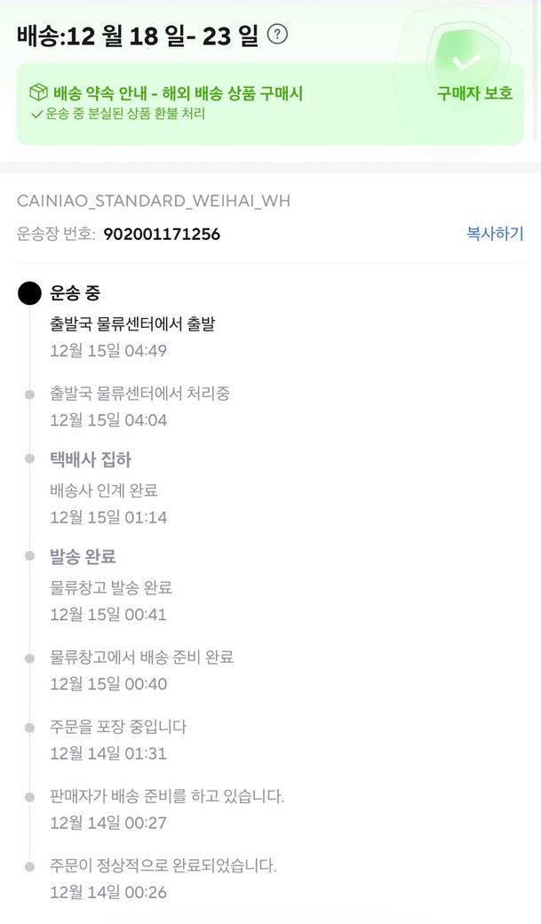 배송기간이 3주이상 오래걸리는 물품이라면 송장조회 안될 가능성이 있습니다.