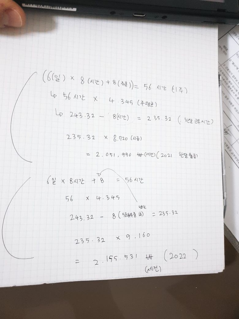그리고 제가 주휴수당계산해봤는데 맞는지 한번봐주세요 좀 이상하긴한데 위는 2021년 밑은 2022년 이에요