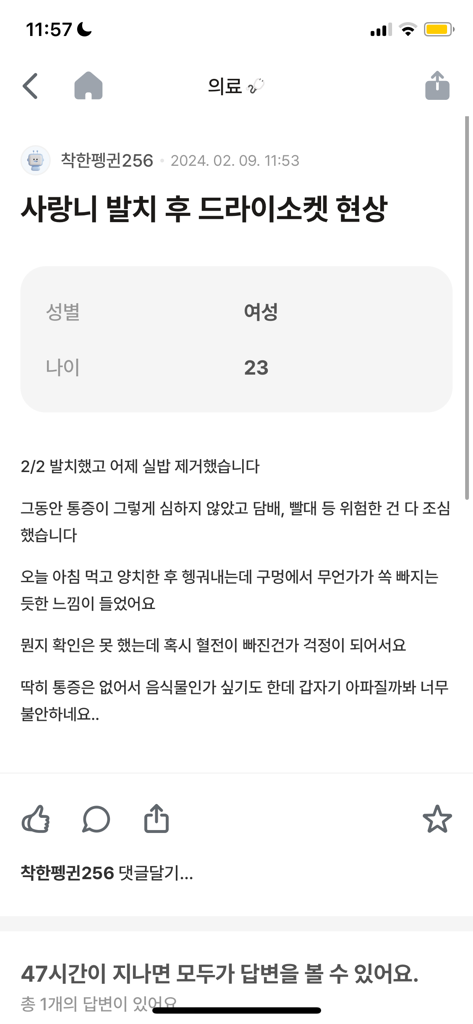 2월 2일 발치를 하셨다면 이미 혈병은 없어졌을 것입니다.