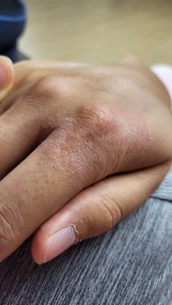 접촉성 알레르기 피부염이나 습진으로 생각됩니다. 주방세제나 작업물질 중 손에 자주 닿는 물질이 있는지 점검해보시고 피해주셔야 합니다. 최근에 바꾼 핸드크림이 있는지도 점검해보시구요. 계속 진행된다면 피부과 내원하여 도포약과 복용약 처방이 필요합니다.
