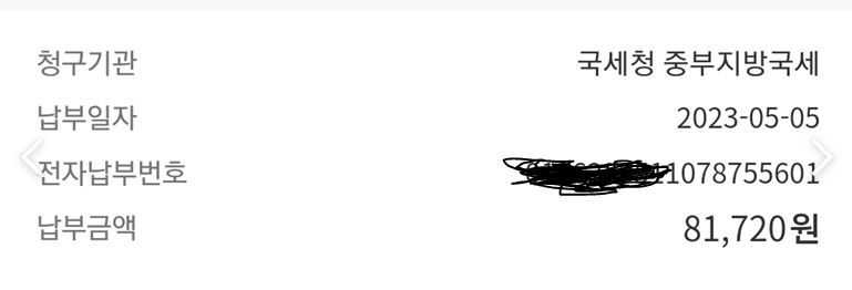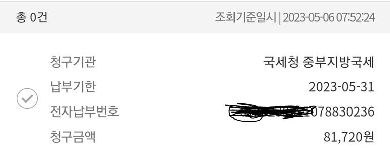 다시 은행 어플 들어가서 국세 항목에 가보니 아래 사진처럼 5월31일까지 81720원을 내라고 표시되어 있더라구요
