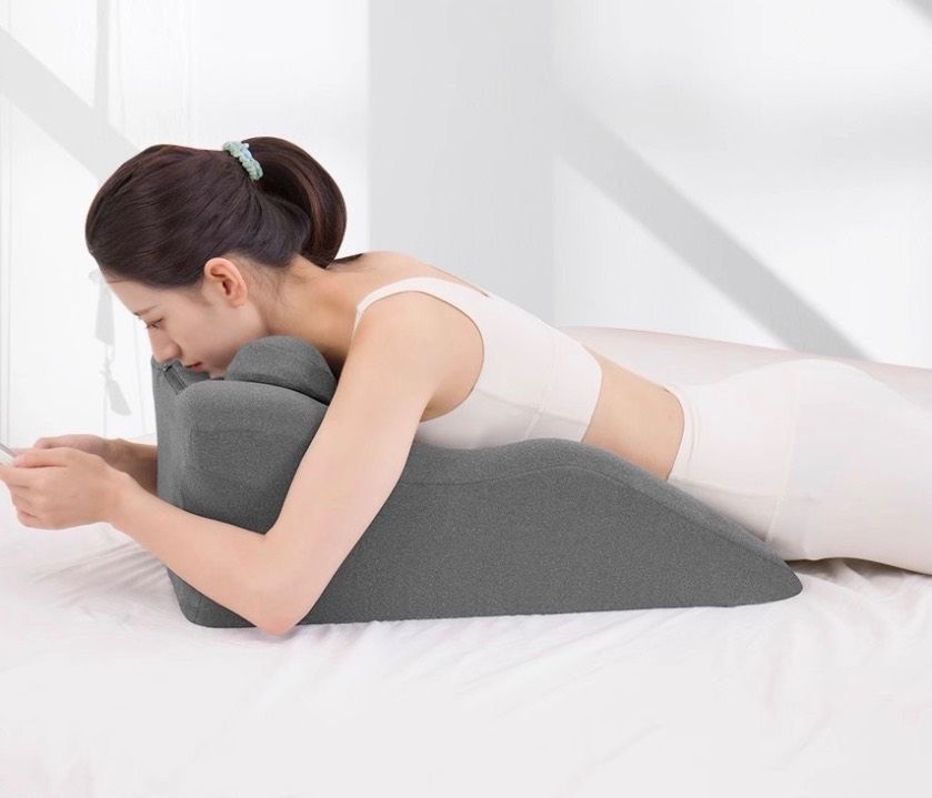 사진과 같이 상체를 베개에 기대고 엎드린 자세는 일반적인 엎드린 자세보다는 허리 굴곡을 일부 줄여줄 수 있으나, 장시간 유지하기에는 바람직하지 않습니다.