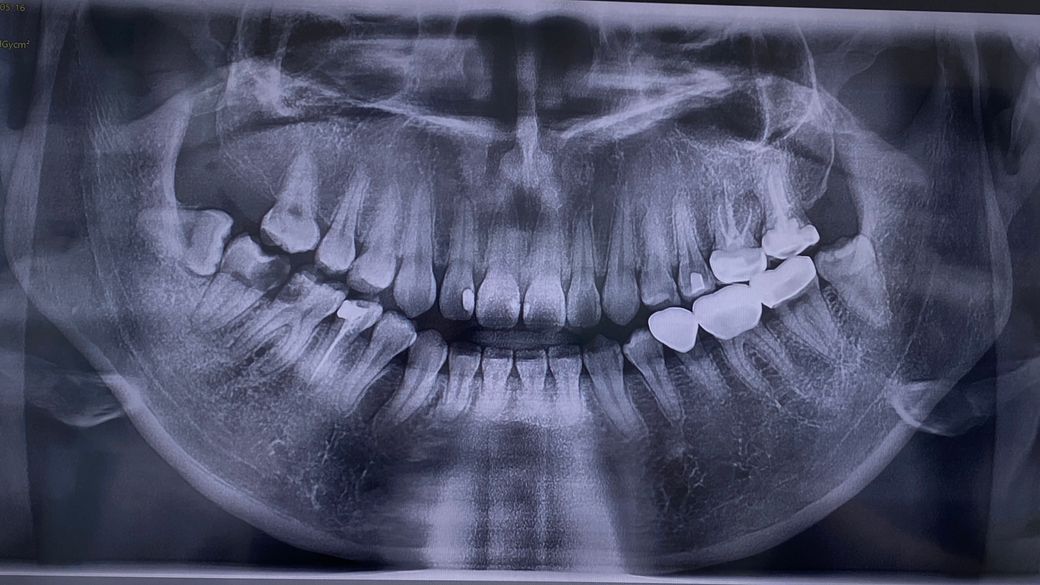 다수의 충치가 보이고 특히 왼쪽 아래는 충치가 심각한 편입니다.