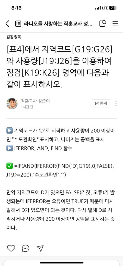 결론부터 말씀드리면 IFERROR, AND, FIND를 함께 사용하는 문제는 “조건 확인 후 오류 처리까지 한 번에 묶는 구조”로 이해하시면 맞습니다. FIND 함수는 특정 문자가 포함되어 있는지 확인하는 역할을 하고, AND 함수는 여러 조건이 동시에 참인지 판단하는 역할을 합니다. 이때 FIND는 찾는 값이 없으면 오류를 반환하기 때문에 그대로 사용하면 수식이 깨질 수 있어 IFERROR로 감싸서 오류를 다른 값으로 처리하는 구조를 만듭니다. 즉 FIND로 포함 여부를 확인하고, AND로 조건을 묶은 뒤, IFERROR로 예외 상황까지 처리하는 흐름이라면 이해 방향은 맞습니다. 다만 실제 문제에서는 TRUE/FALSE 판단 기준과 반환값을 정확히 설정하는 것이 중요합니다.