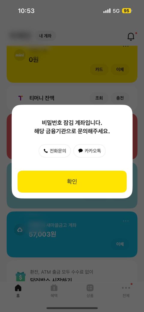 카카오뱅크에 새마을금고 계좌를 등록을 해서 쓰고 있었는데 어제 제가 미니카드에서 새마을금고 계좌에 돈을 넣고, 다시 미니카드에 돈을 넣으려 했는데 잠김 계좌라고 안 보내져요ㅠㅠ 다른 계좌에도 보냈더니 똑같이 잠김 계좌라고 안 보내지는데 이거 뭔가요..? ㅠㅠ 카드 결제는 되는 것 같아요..