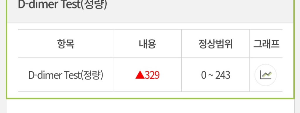 D-dimer 는 몸에 혈전성 질환, 폐동맥 혈전증이나 심부정맥혈전증을 의심할수 있는 수치인 것은 맞으나 상당히 비특이적인 검사 (정상에서도 올라갈수 있는) 이기 때문에 관련한 증상이 동반되어 있지 않다면 의미가 있다고 보기는 어렵습니다.