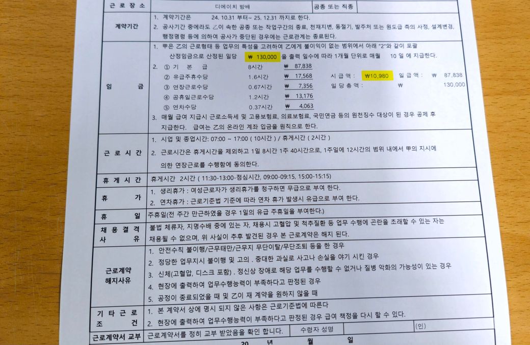 합해서 일당이 130,000원 입니다. 주 6일이며